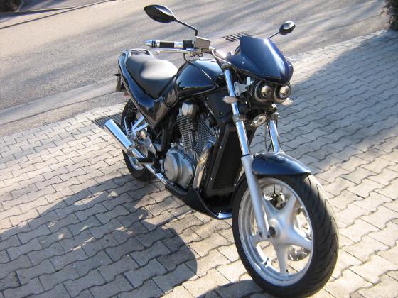 Super-Bike-Lenker LSL 02,Stahlflex-Bremsleitungen vorne + hinten, LED-Miniblinker, Bugspoiler, Doppelrücklicht von einer FZS 1000, Mini-Gepäckbrücke(Von Erwin) und JETZT IKON-Stoßdämpfer, Michelin Pilot-Road 2 2ct, ne richtig geile Sitzbank von Jungbluth, doppel DE-Linsennscheinwerfer, Mini-Maske, Angel-Eyes Standlichtringe, Zusatz-Blinkerkontrollleuchte, France-Equipment Bremsscheiben + AP-Racing Sinterbeläge hinten und vorne, Marving Auspuff.. wird fortgesetzt.