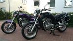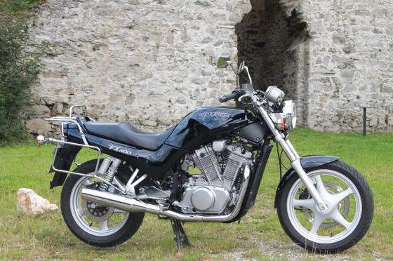 Progressive Gabelfedern von Wilbers,Stahlflex Bremsleitungen von Melvin, Hepco Becker Träger, Rest original. Und für die Touren mit Sozia noch eine King & Queen Sitzbank.