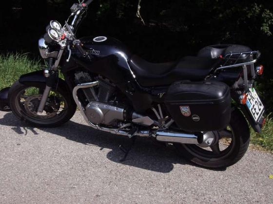 Spiegler Bremsleitung vorne, Cruiser-Seitenkoffer von Givi, Gepäckträger für Givi-Topcase/kleiner Enduro-Lenker seit 07/2006. Corbin-Sitzbank seit 10/2005