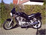 schwarze Minitourenscheibe von Puig, Stahlflexbremsschläuche von SPIEGLER vorn und hinten, Kofferträger-Gepäckbrücke schwarz von Hepco&Becker, Edelstahllenkerenden von FRITS ;-) VA-Lenkkopfverkleidung poliert, hinterlegt mit schwarzem Racinggitter von Peter Nowak ;-) Schwinge schwarz pulverbeschichtet, Kardangehäuse schwarz lackiert, Cateye-Miniblinker chrom mit schwarzem Blinkerglas, JAMA 2in2 Auspuffanlage