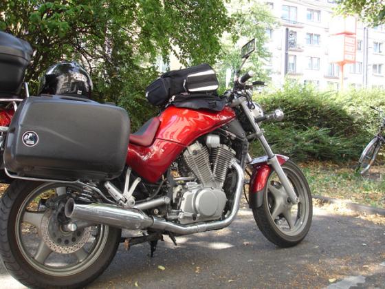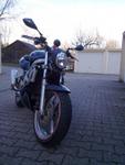 Kleines Windschild, Hepko&Becker-Träger mit Koffen und Topcase. 2farbig bezogene Sitzbank. Wilbers-Gabelfedern. Hab die Gute inzwischen verkauft und fahre jetzt eine Suzuki SV650N. Ein Bild hänge ich von ihr hier rein. ;-)