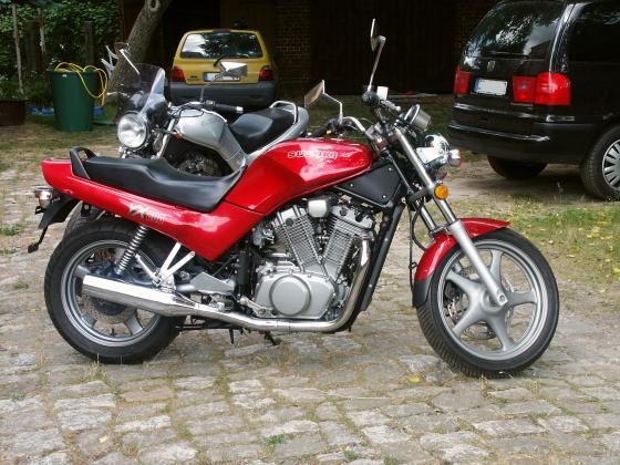 VS 51 A , (fast) naturbelassen, wie Suzuki sie schuf. Ein Rettungskauf, optisch recht angegammelt und sie lief nicht mehr. Hab sie wieder hinbekommen (bis auf die Federbeine, die hatten leider Rostlöcher an der Dämpferstange, nun sind Hagon drin). Bleibt als Reservemopped, wenn die Silberne ...