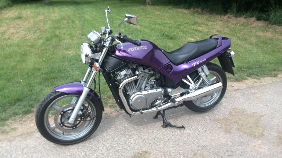 Wiwo Drahtspeichenräder, progressive Gabelfedern von Wilbers, Lucas Stahlflex Bremsleitung.------ Suzuki VX 800, Baujahr 1992, Laufleistung 48000 km, Farbe Deep Purple Metallic (1HU) Wiwo Drahtspeichenräder