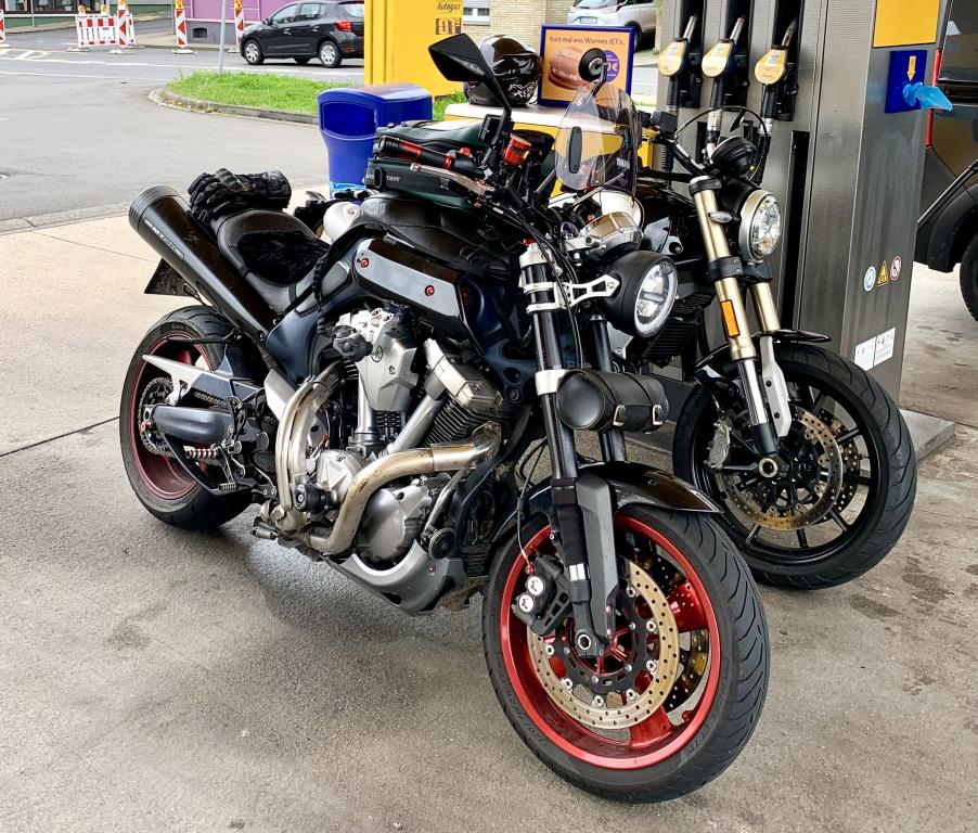 Die Zweite: Lenker, Konis, Wilbers, Stahlflex, LED-Blinker, Faltenbälge, Fender (vorne und hinten) von Triumph Thruxton, Lenkerendspiegel, Heck, Windschild, Klarglaslampe, Tankschutz Bagster, Sattel aufgepolstert
