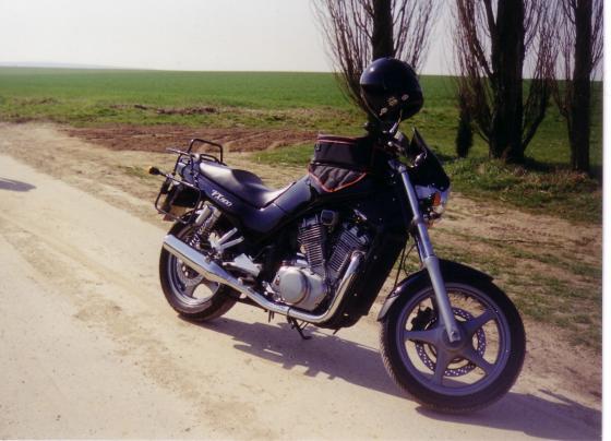Nach und nach umgebaut wie folgt: Spiegler Stahlflex v + h, schwarze Minischeibe, Hepco + Becker Träger + Junior 40l Koffer, progressive Wirth-Gabelfedern + Öl, 2 in 1 BSM V2A Future, V2A Kühlerverkleidung, Ölthermometer